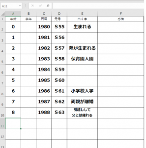 こんな風に、時系列で年齢と出来事を簡単に書いていきます。思い出せなければ、飛ばして書き続けます。そして正確でなくても構いません、だいたいでいいです。